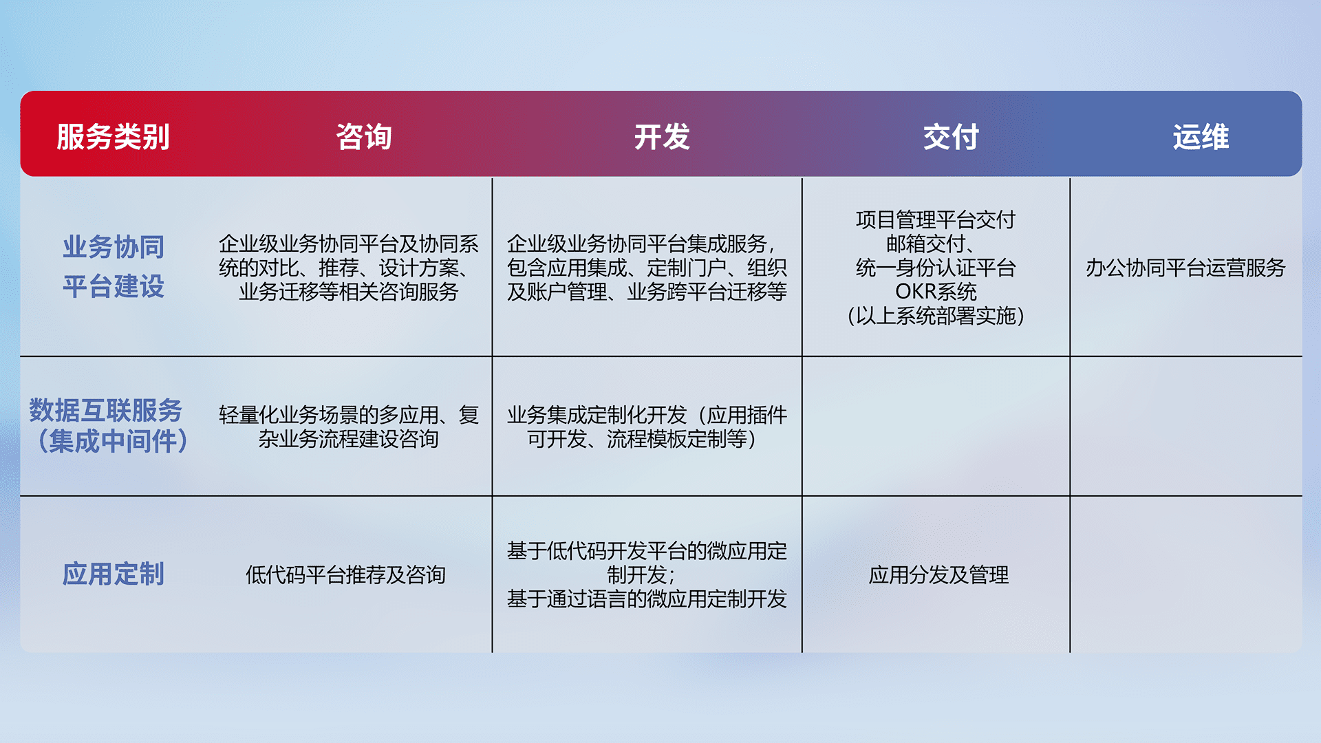 针对钉钉、、、、企微、、、、IDaas等平台级产品提供产品的规划、、方案、、交付、、、、定制化开发等服务,,实现如统一协同办公、、、、智能客户服务、、、、混合会议管理、、、、智能数据查询、、、、等业务场景,,实现数字化转型。。