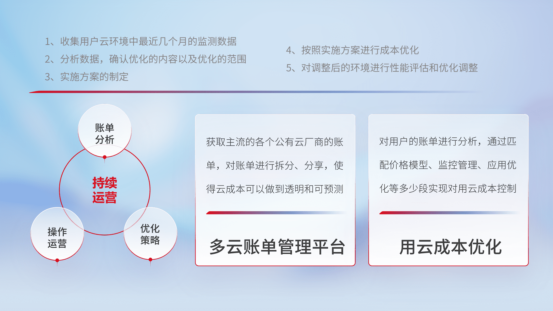 通过多云纳管,,以统一的资源数据模型把客户的云资源进行抽象和封装,,,进而实现对多云资源的统一操作,,,,保障云资源管理的可靠性、、稳定性与可用性。。。量身定制化运维内容,,配置、、开发运维、、、补丁管理、、备份、、、、监控、、、认证和访问管理、、、审计和日常巡检等,,,保障在用云过程中的可靠度,,,稳定度以及高可用率。。。。