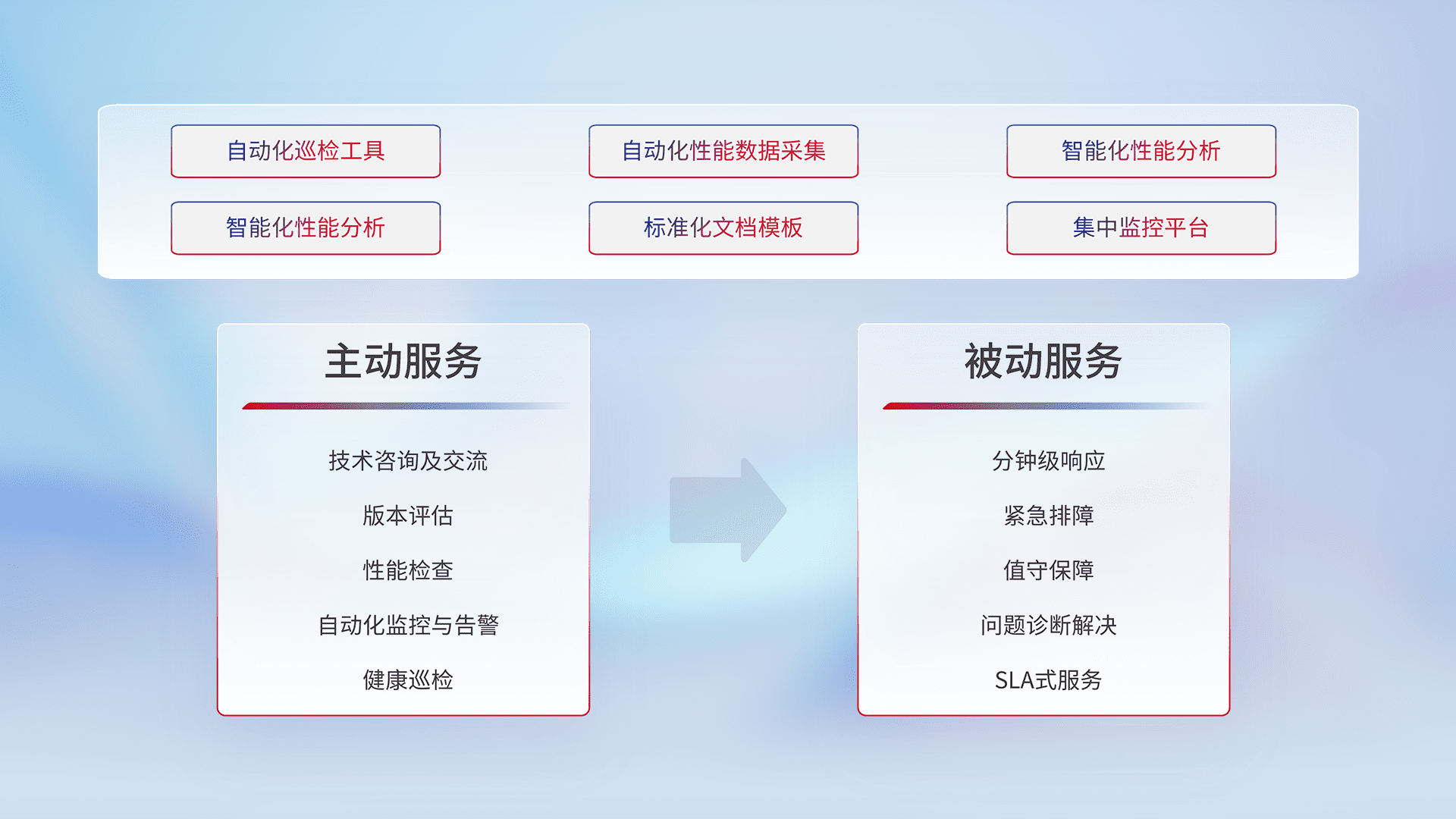 智能化工具和标准化文档,,保障服务质量,,,,提供主动服务(包含技术咨询、、版本评估、、性能检查、、、、自动化监控与告警、、、、健康巡检)和被动服务包含(分钟级响应、、紧急排障、、值守保障、、、、问题诊断解决、、、SLA服务)。。